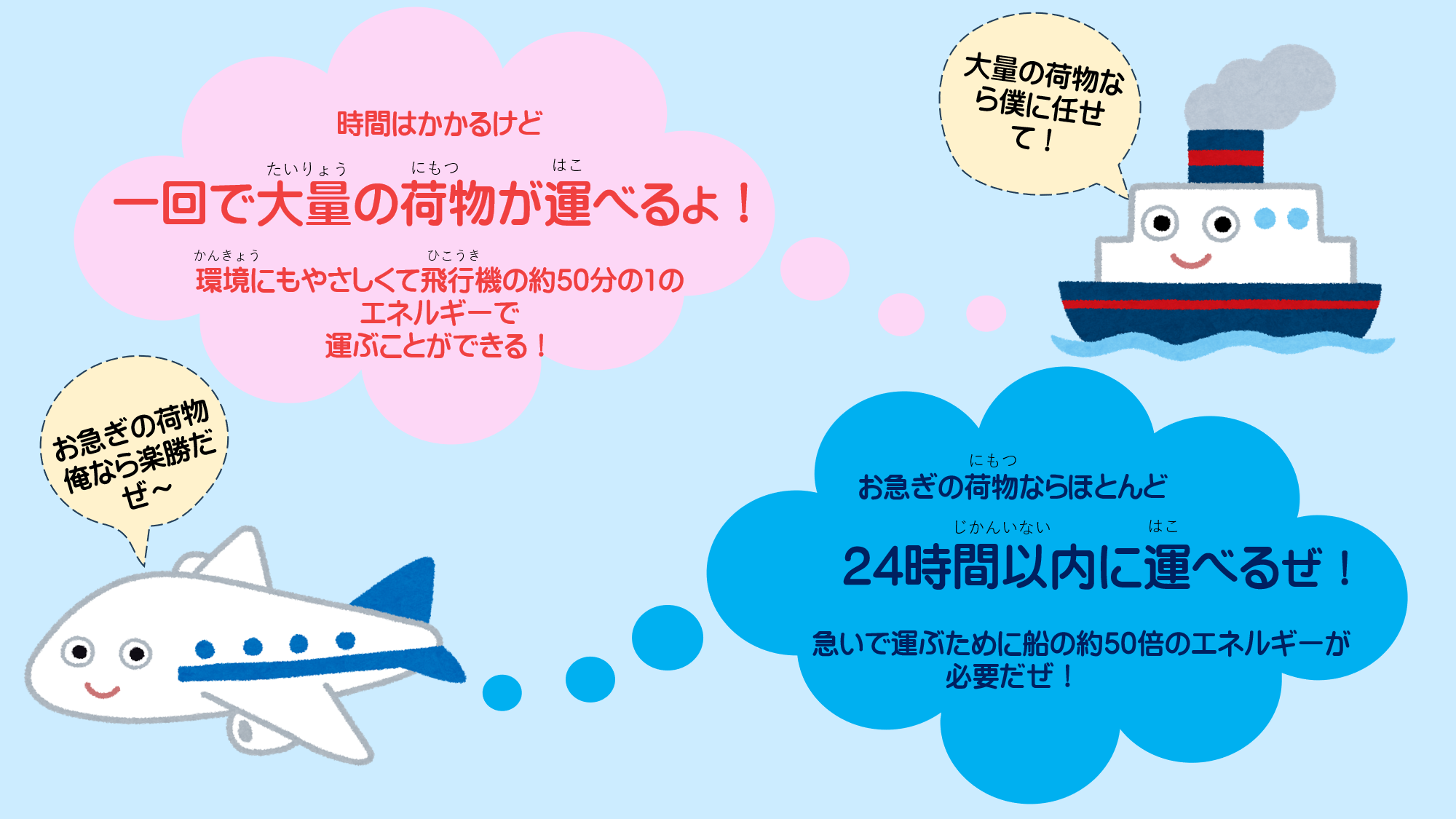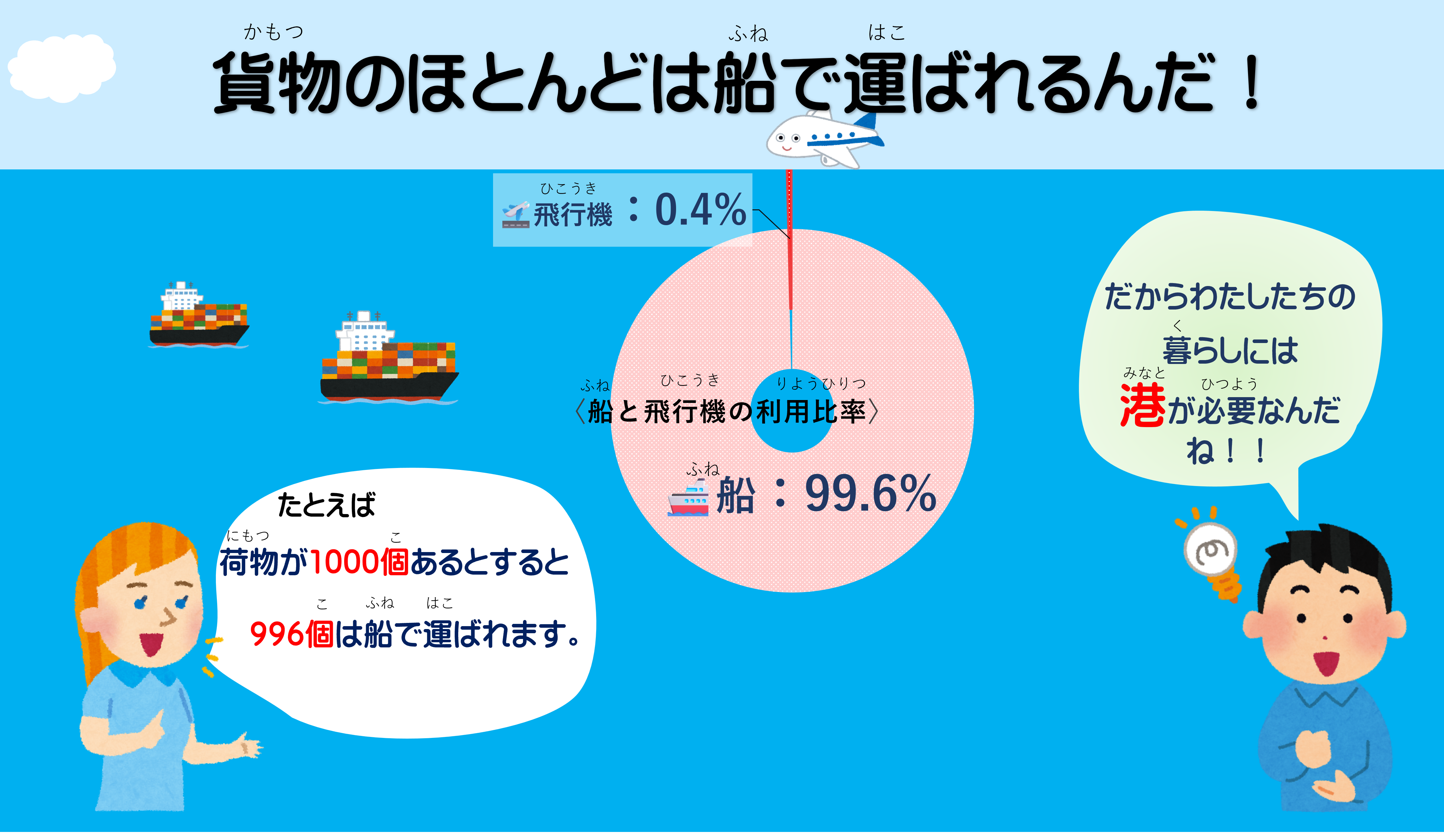 つまり、日本と外国でやりとりする荷物が1000コあるとしたら、996コは船で港を使って運ばれ、残りの4コは主に飛行機で空港を使って運ばれていると言えます。
