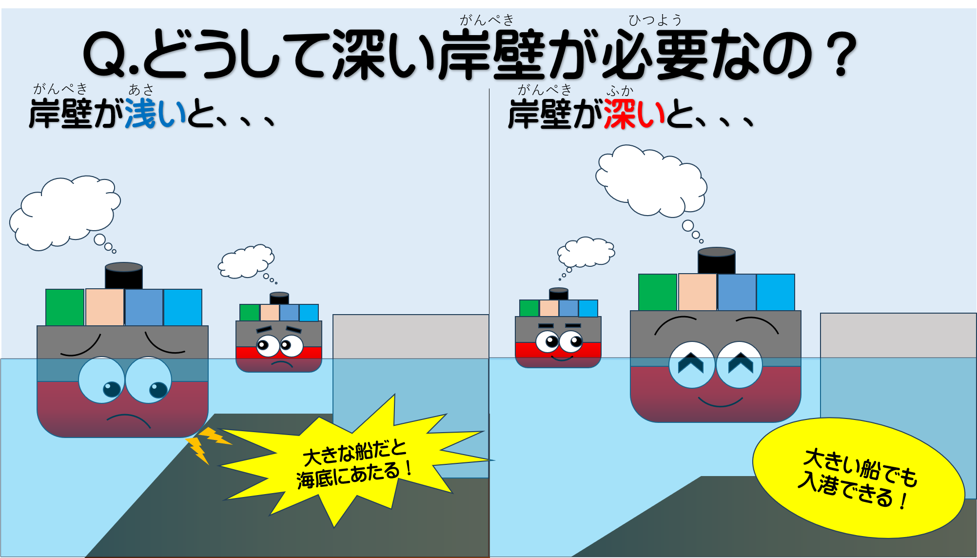 岸壁は、船をとめて安全に荷物を積み下ろしたり、人々が乗り降りしたりするための施設です。