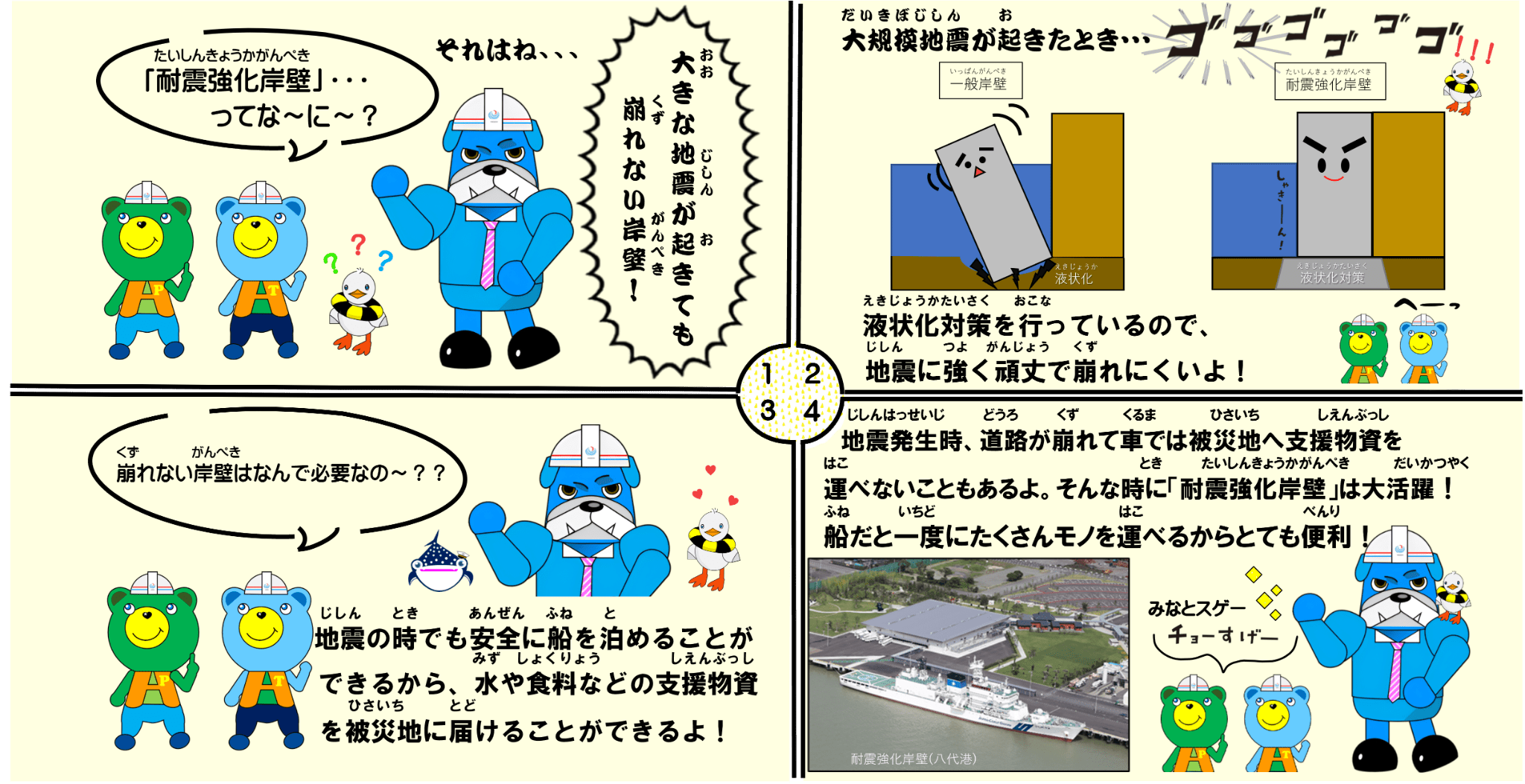 大きな地震が起きたあとでも、港で荷物の積み下ろしや人の乗り降りができるようにするため、地震に強い「耐震強化岸壁」も全国の港で作られています。