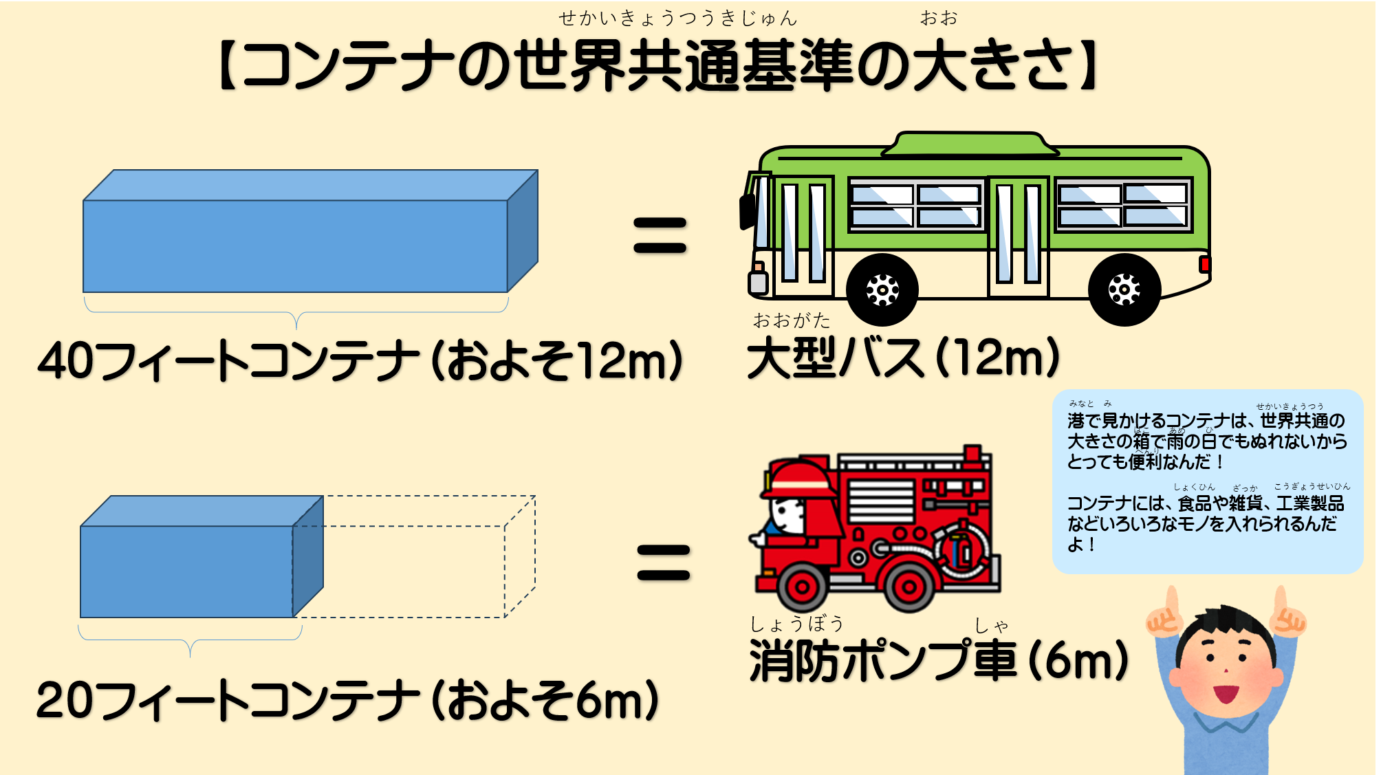 そうすることで、世界中の港で短い時間と少ない人手で安全に港の作業(コンテナを船にのせたり、おろす作業)ができるのです。