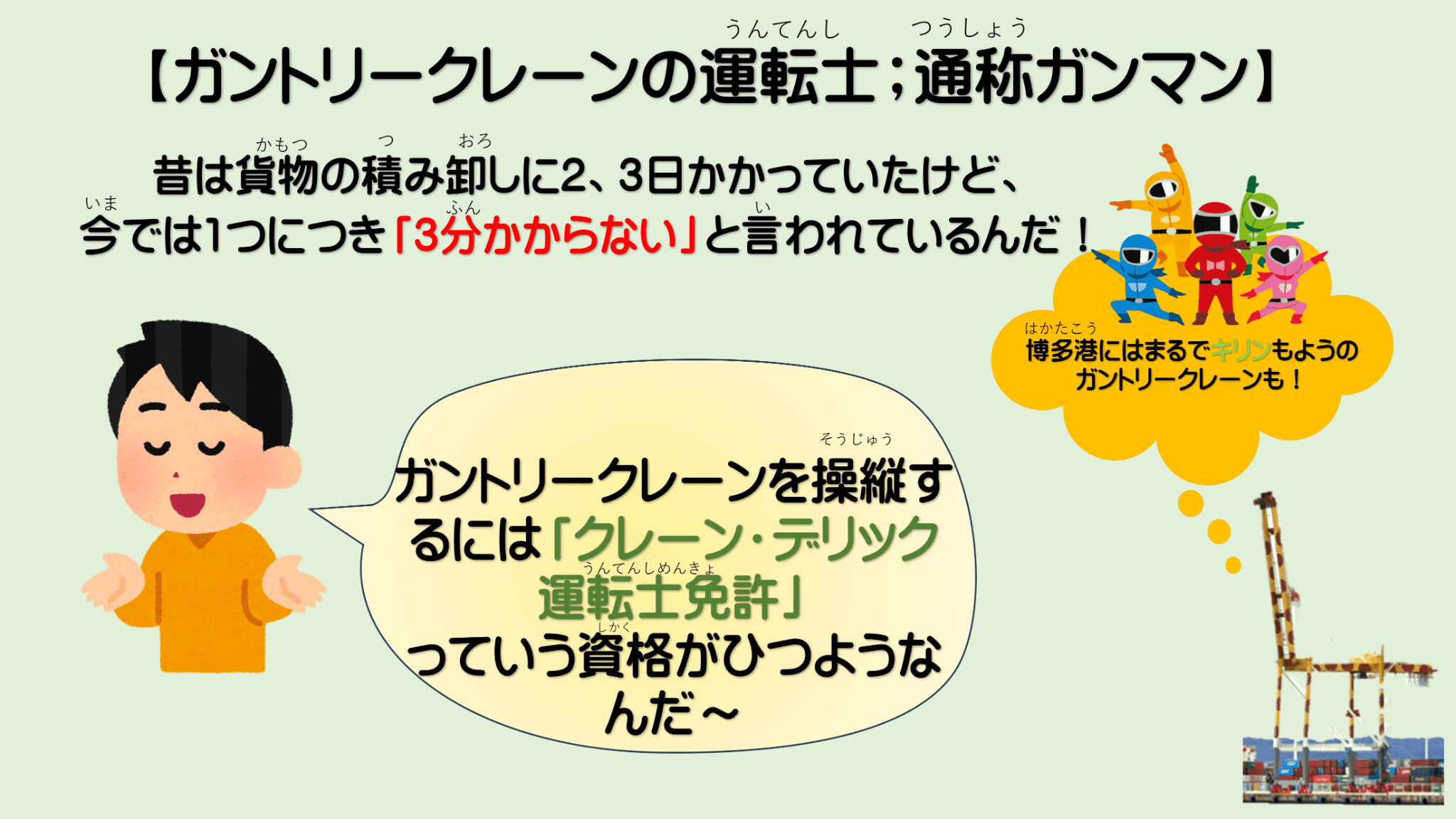 ガントリークレーンに乗ってコンテナの積み下ろしを行う人のことを「ガンマン」とよびます。