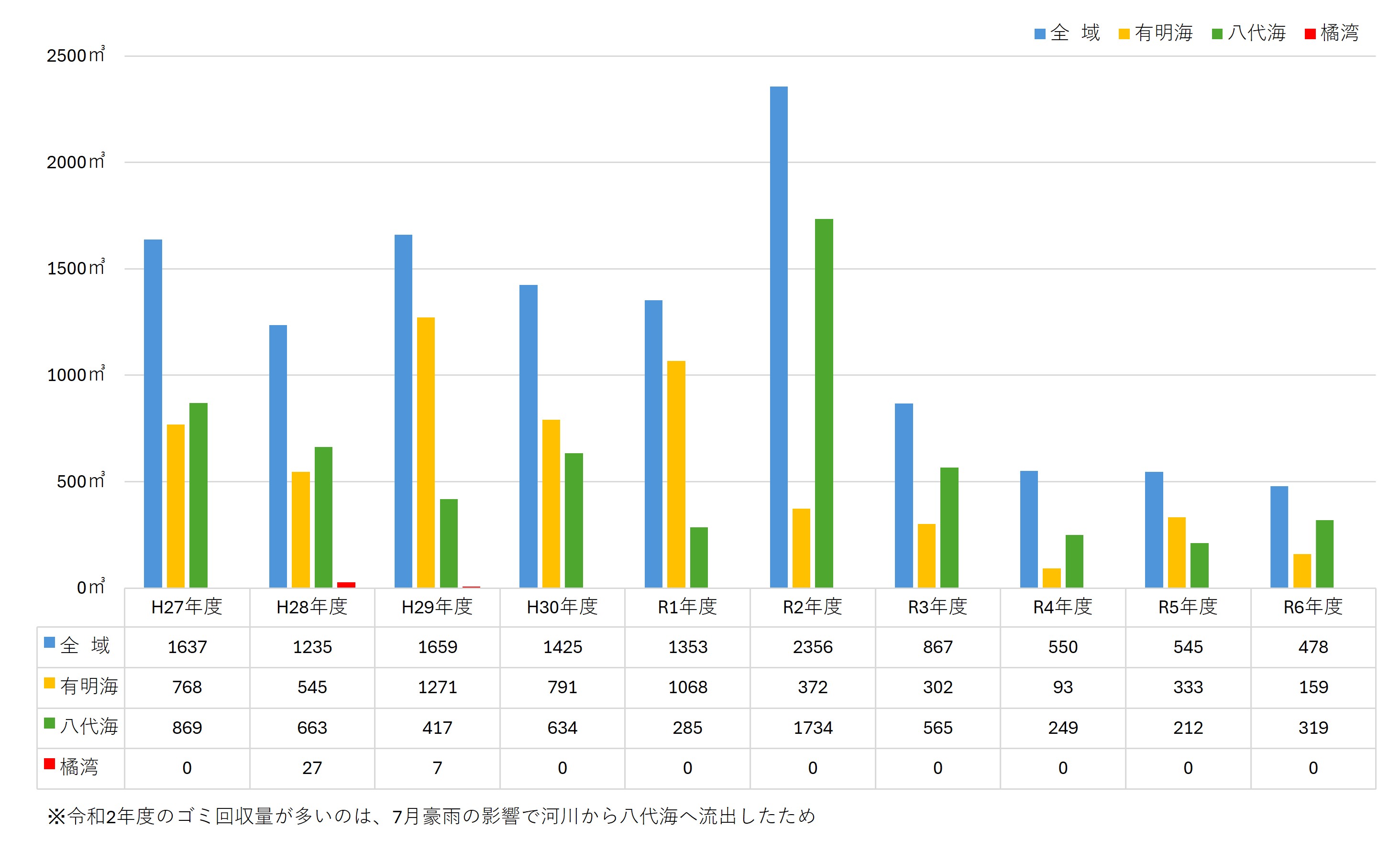 そのため、熊本港湾・空港整備事務所では閉鎖性水域である有明海及び八代海の環境整備を実施するために、漂流ごみの回収機能に加え、水質・底質調査、潮流観測等の広域的海洋環境調査が行える多目的機能を有した海洋環境整備船を配備し、同海域における海面清掃や環境調査等の総合的環境整備事業に取り組んでいます。