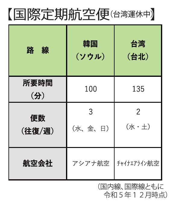 また、年々増加するチャーター便の円滑な受け入れと国際定期便の就航に対応するため、ターミナルビルの増改築に併せて、CIQ施設等を含む国際線専用施設を整備し、平成13年6月には宮崎とソウル間に、平成20年6月には宮崎と台北に国際定期便が就航しています。